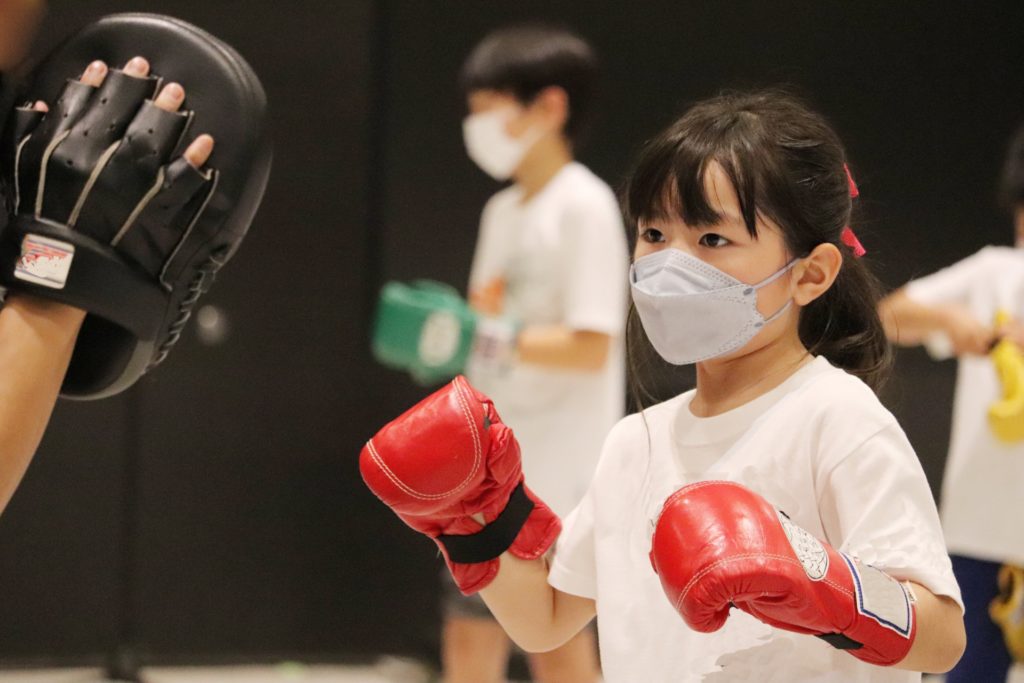 ミットに向かって練習したパンチやキックを打ち込練習。